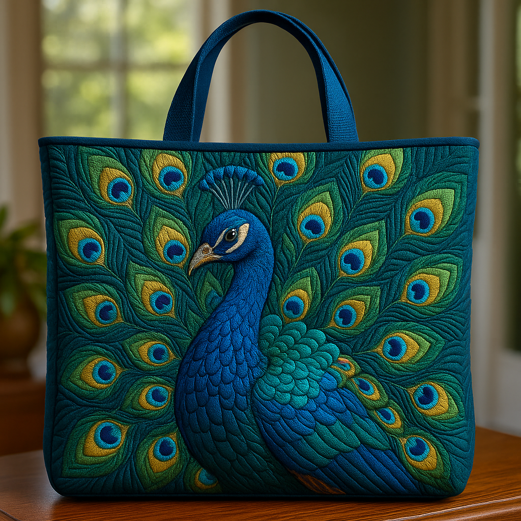 Peacock Quilted Tote Bag ⚡ Vibrant Feather Patchwork Art